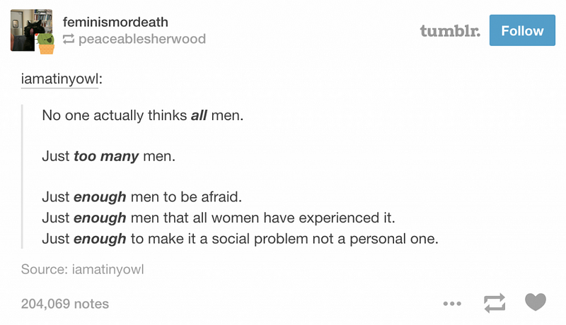 Not just to me, though that was plenty overwhelming. It also happened to all the women I knew, whether it was a partner, a family member, a coworker, a friend. And I noticed how often any attempt to discuss how frustrating it was outside of a women-only space would be derailed into men protesting they weren’t like that, and anyway what could they possibly be expected to do about it, masculinity was a rough gig too after all, didn’t we feel for them?